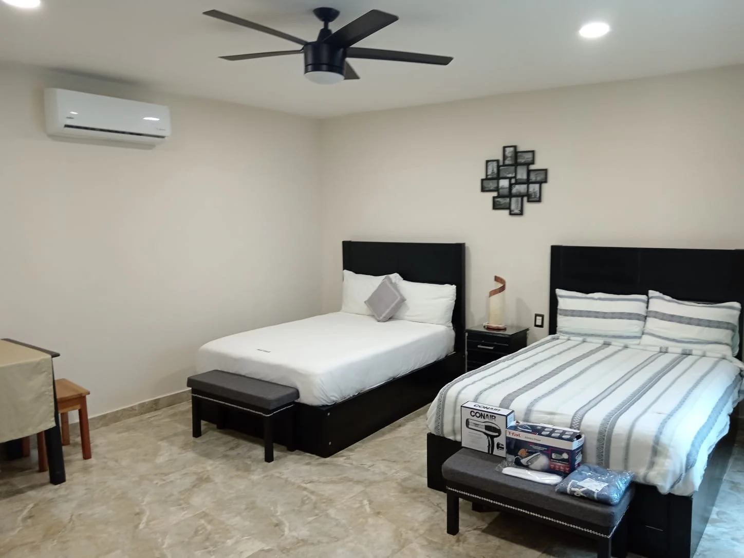 Además de las amenidades base, incluye un set ampliado de accesorios: toallas extra, bata ligera, pantuflas, plancha, secadora y amenities de baño mejor presentadas; todo apoyado por climatización eficiente y WiFi estable.